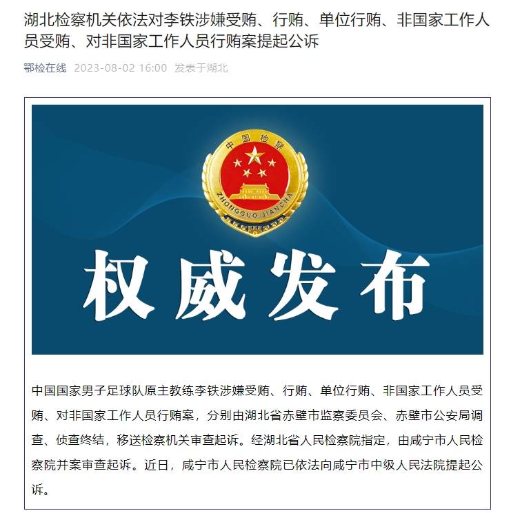 中国国家男子足球队原主教练李铁涉嫌受贿、行贿、单位行贿、非国家工作人员受贿、对非国家工作人员行贿案,分别由湖北省赤壁市监察委员会、赤壁市公安局调查、侦查终结,移送检察机关审查起诉。经湖北省人民检察院指定,由咸宁市人民检察院并案审查起诉。近日,咸宁市人民检察院已依法向咸宁市中级人民法院提起公诉。