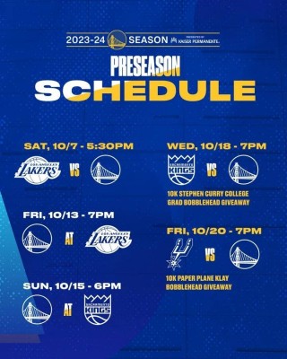 北京时间8月3日,勇士官方公布了新赛季的季前赛赛程,10月8日准时开打,共进行5场比赛,先后对决湖人、国王与马刺。