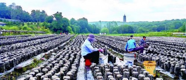 安图县二道镇四合村农户张秀华今年种植无公害木耳10万袋,产品远销青岛、北京、海南等地。图为张秀华和工人在采摘木耳。