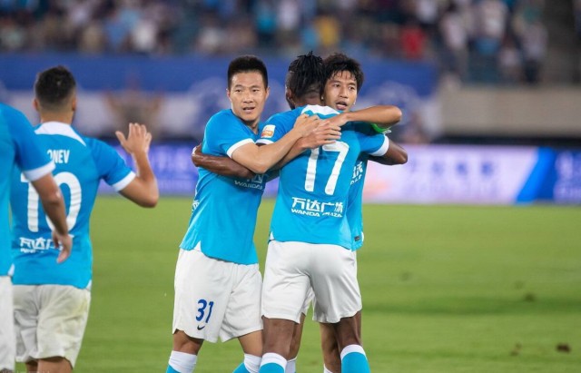 曼佐基、朱挺、吕鹏、特索涅夫和吴伟庆祝进球。
