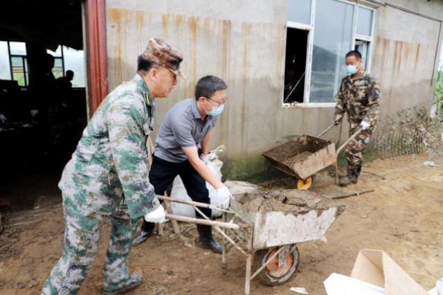 强降雨过后,敦化市纪检监察部门立即组织清淤志愿团队和消杀小分队深入受灾农户家中,帮助人民群众灾后清淤,尽快恢复正常的生产生活。图为敦化市纪检监察干部在额穆镇珠尔多河村和村干部一起清理受灾农户院落里的淤泥。