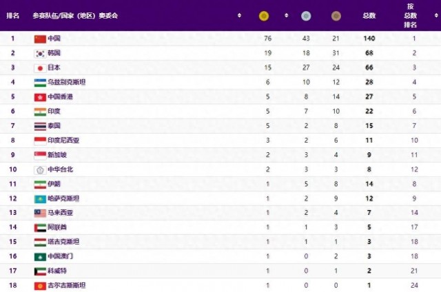 您的当前位置:智慧体育首页 > 看资讯 > 新闻资讯 > 亚运会最新奖牌榜:中国单日轰23金,76金遥遥领先,日韩共34金