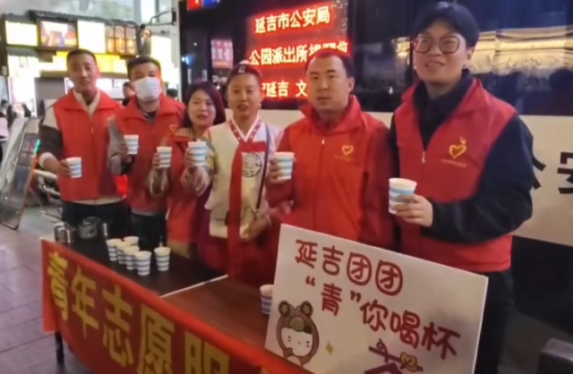 当天,记者在延边大学正门对面的人行步道上看到,共青团延吉市委工作人员支起了两张折叠桌,桌上摆放着暖瓶、一次性纸杯、茶叶等物品,几位青年志愿者分别身着民族服饰和印有“延边青年志愿者”标识的红马甲,为过往的市民和游客送上一杯杯热茶,并耐心细致地解答游客问询。
