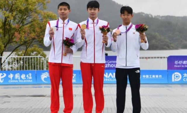 皮划艇赛场,激流回旋男子单人划艇,中国选手全鑫以89.24分,日本和中国台北选手获得银牌和铜牌。