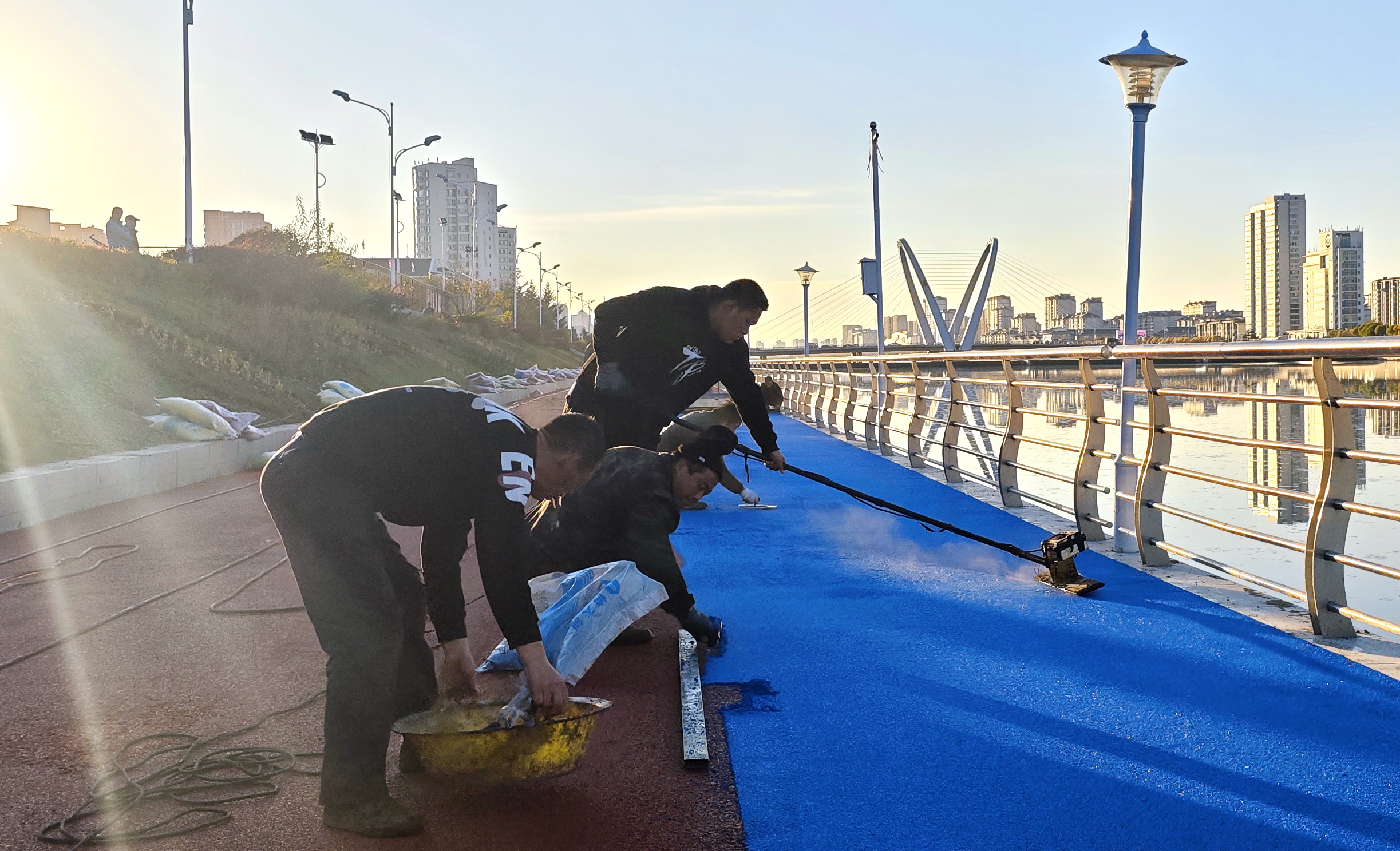 延吉市布尔哈通河城区段综合治理项目正在持续推进,两岸彩色塑胶跑道雏形初现,艳丽的色彩,宽敞的视野,舒适的脚感,将为市民提供一个美丽舒适的运动空间,增加了幸福指数,提高了城市品位。图为施工现场。