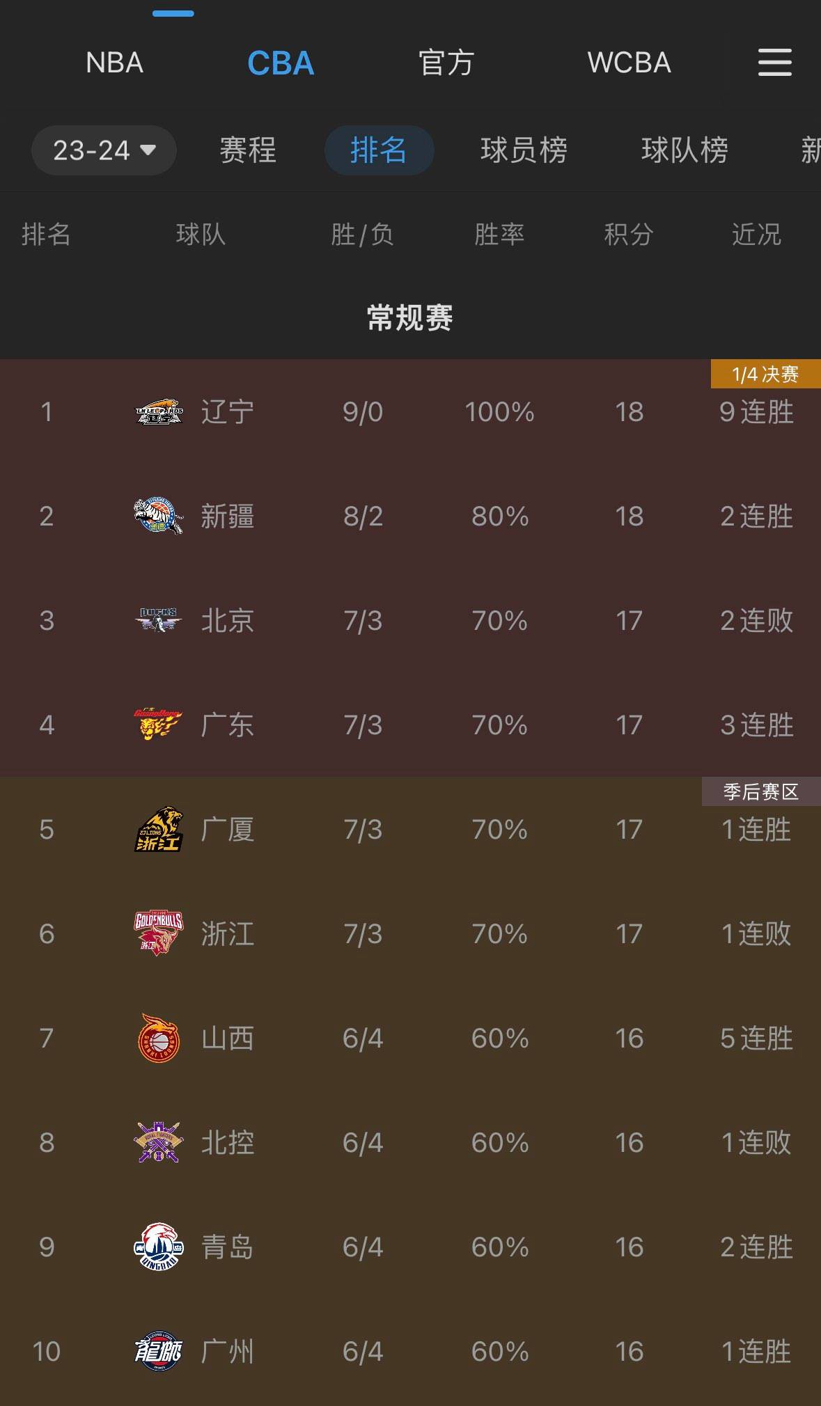 11月19日,CBA常规赛新疆112-105战胜北控,CBA第一阶段正式结束。辽宁9连胜保持不败,新疆8胜2负跃居第二。