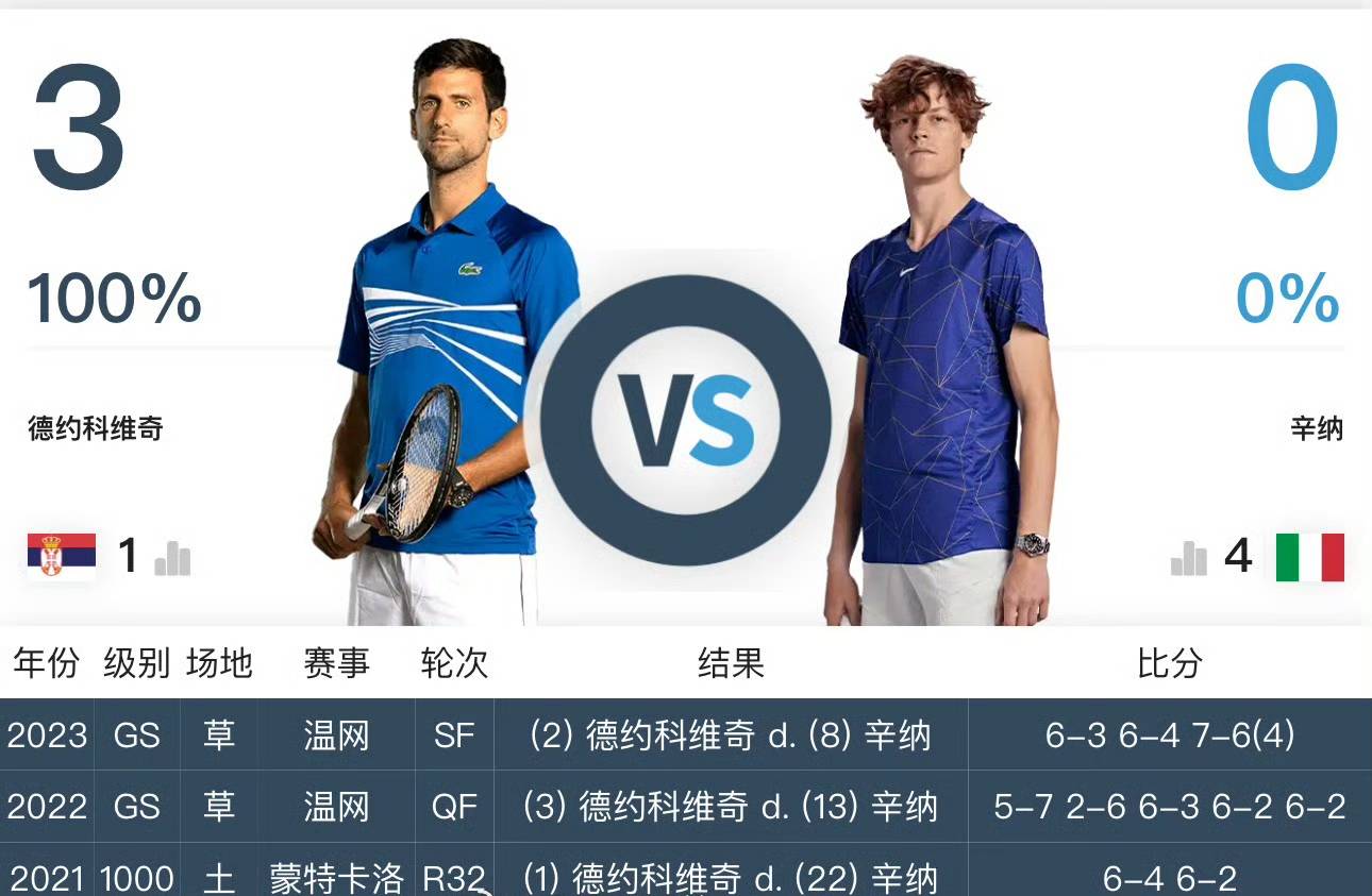 两人此前共4次交手,最近一次交手就发生在数日之前。在小组赛第二轮中,当时两人鏖战超过3小时,最终辛纳以7:5 6:7(5) 7:6(2)才艰难地拿下对德约科维奇的职业生涯首胜。不过,值得一提的是,尚未有人可以在单届年终总决赛中“双杀”德约科维奇。