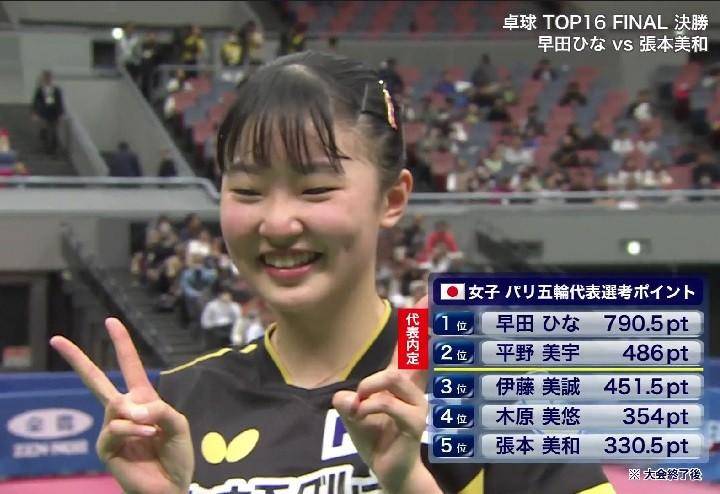 张本美和的进步非常显著。在本次大会25日的四分之一决赛中,以4比2击败了选拔排行榜第3名伊藤美诚(Starts)。在当天的半决赛中,以4比2击败了长崎美柚(均为木下组合),进入决赛。在本月上旬的WTT冠军法兰克福第1轮比赛中也战胜了平野美宇,对早田、伊藤、平野的“黄金世代”3人,美和全部取得过胜利了。