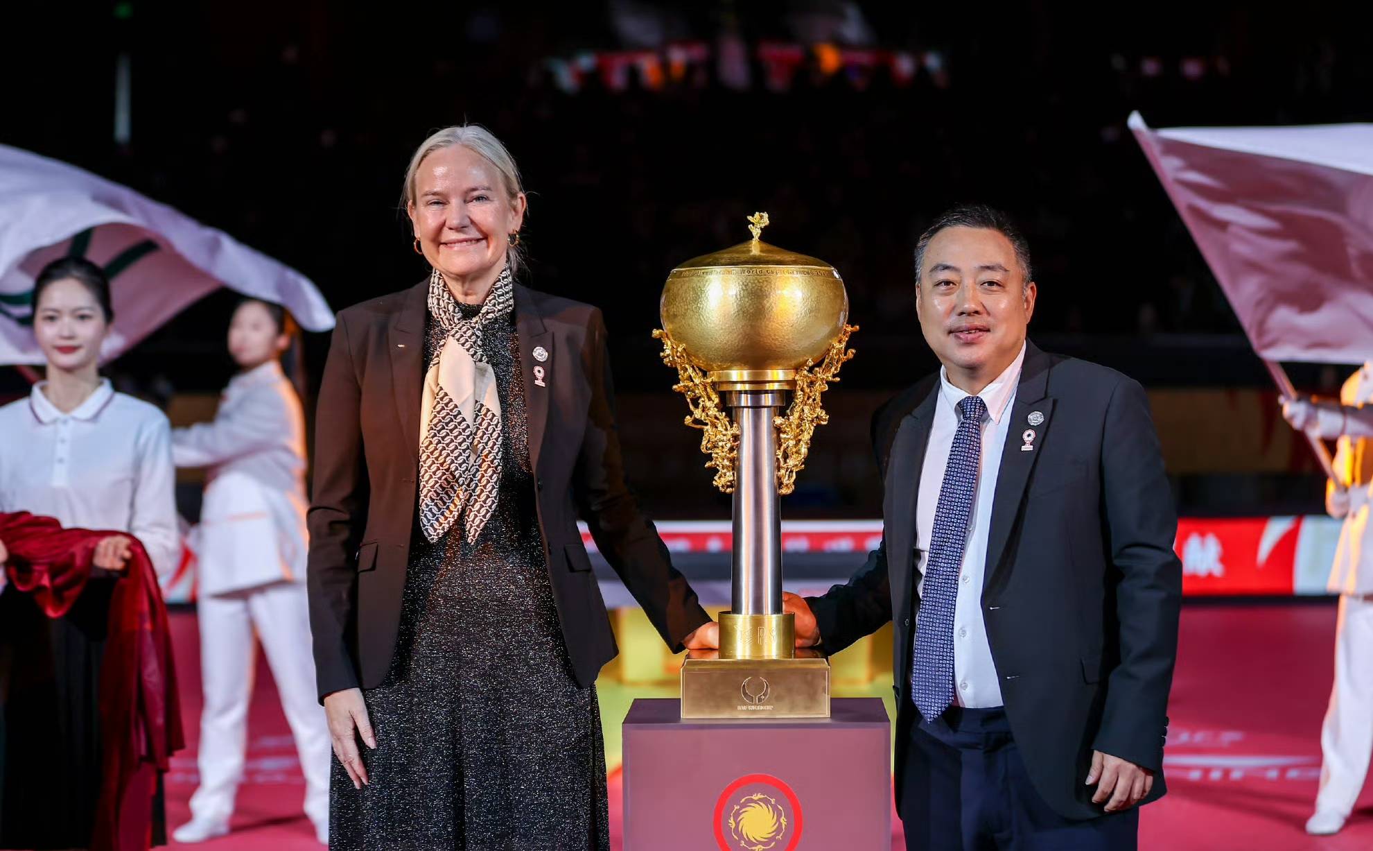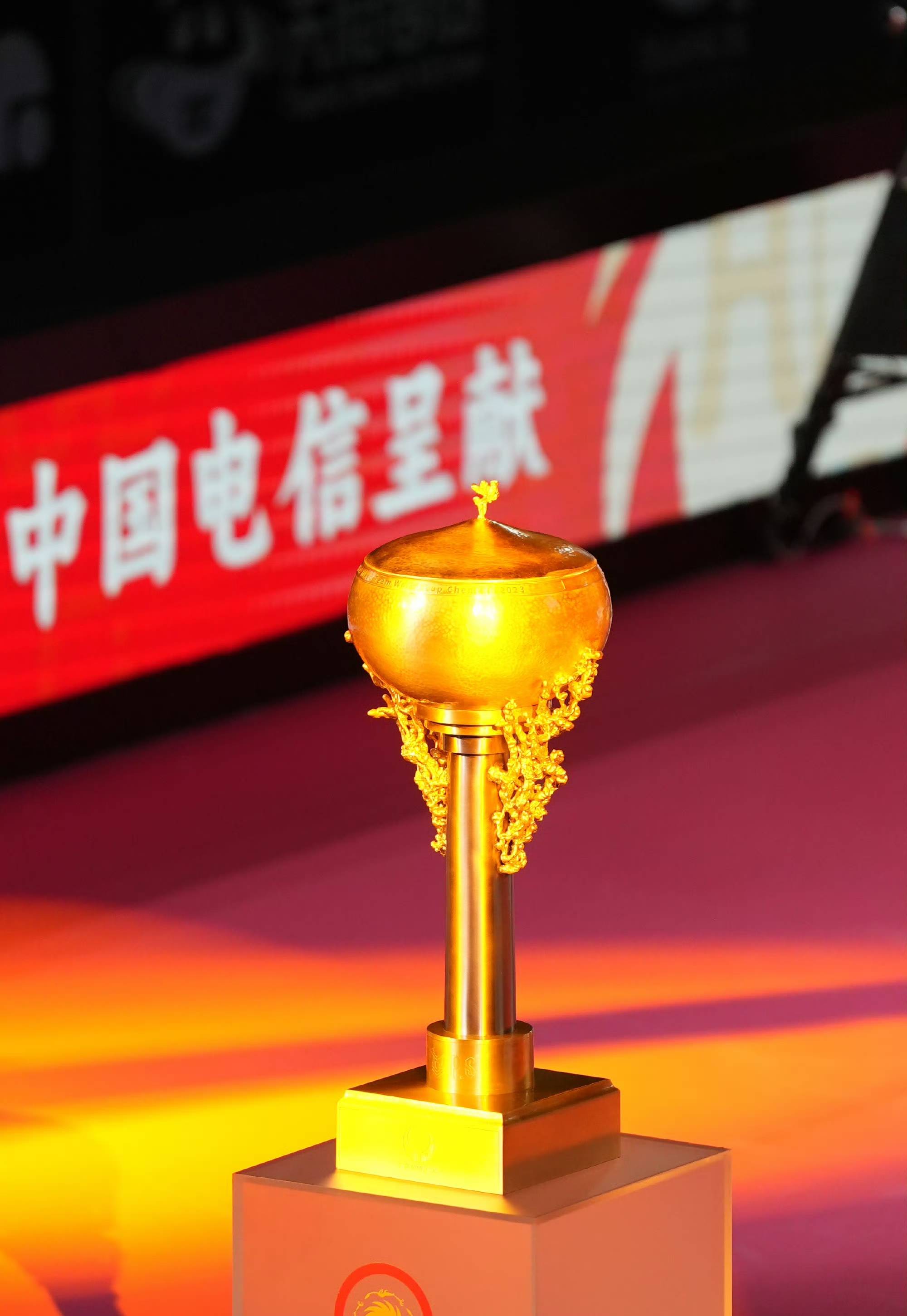 这宣誓仪式上,世界乒联主席佩特拉·索林和副主席刘国梁出席仪式。另外备受球迷关注的冠军奖杯也正式曝光。这座冠军奖杯由工艺大师朱炳仁亲自制作,金灿灿的颜色,充满寓意的造型让这座奖杯成为球迷关注的亮点。相信国乒主力球员一定会争取将首座混合世界杯的冠军奖杯留在中国。