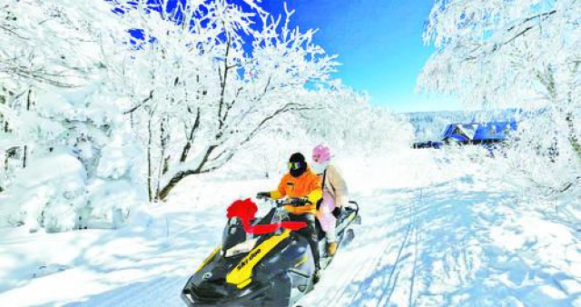 延边雪岭景区利用得天独厚的长白山冰雪资源及原始森林地貌,开发了林海雪原穿越、雪上摩托、马拉爬犁等体验项目,在这里,游客可拍摄梦幻美照,尽情感受冬日乐趣。图为游客在雪岭景区体验雪上摩托。
