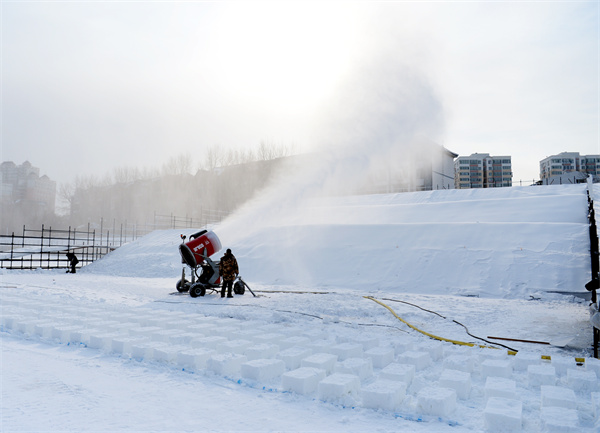 现场,一边是一台造雪机伴随着轰鸣声不断喷出雪雾。这些雪雾在空中凝结后,洒落在工人们搭好的铁架上,形成了一座壮观的“雪山”。另一边,工人们将雪放进模具中,靠着双脚将白雪踩实,制作成长方体雪块用来铺设雪地和围墙。一下、两下……在他们的努力下,松散的白雪很快制成了坚实的雪块。