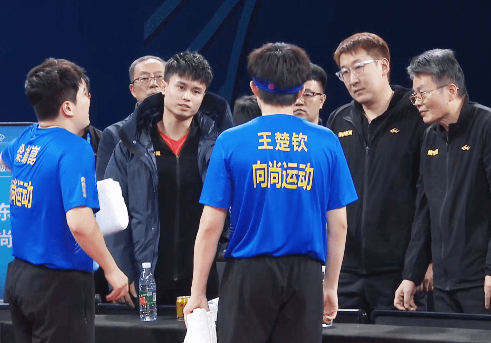第二局王楚钦/梁靖崑又是节节败退,连续丢分后,尹霄教练不得不叫出暂停进行调整:毕竟是五局三胜制,再输的话就要被逼入绝境了,两个弟子的思想明显出了问题,得赶紧解决。