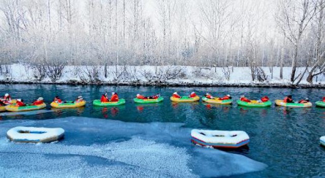 长白山风光无限,不仅有恢弘大气的天池和峡谷,还有绝美秘境——雾凇。12月的安图县水色雾凇岛,树林在雾凇的映衬下变得神秘妖娆,令人陶醉。图为体验漂流的游客正沉浸在梦幻般的冰雪雾凇世界中。