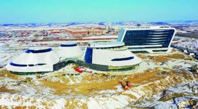 珲春市东北虎豹科普教育及资源展示设施项目总投资3.13亿元,主要建设东北虎豹科普宣教展示基地、综合服务楼及其附属配套设施。目前,项目主体工程已完工,装饰工程将于2024年启动。图为鸟瞰项目。