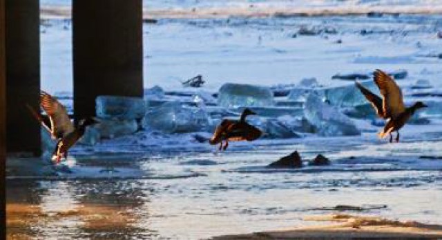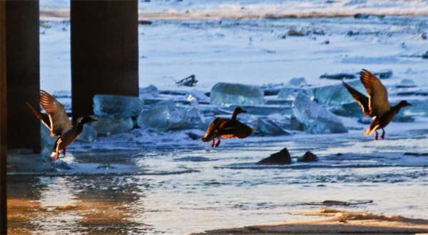 “竹外桃花三两枝,春江水暖鸭先知。”这原本是描绘春暖冰融时的景象,眼下正是数九寒天,可在牡丹江敦化流域敖东大桥附近还没有封冻的江面上,却有一群野鸭在水里嬉戏、觅食,给冬日的敦化增添了几分“春意”。
