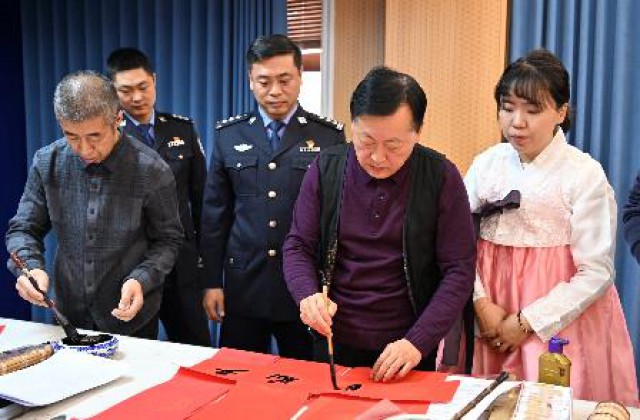 1月31日,“铸牢中华民族共同体意识民族团结一家亲”2024“迎春送福送万家”警民共建活动在开山屯出入境边防检查站举办。来自延边美术馆、延边书法家协会、延边长白山书画院、延边印社、延边画院和延边硬笔书法家协会的艺术家们纷纷献技,书写春联、作画,把迎春活动推向高潮。