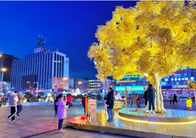 位于延吉百利城前的金色大树和“我爱延吉”造型灯让市民和游客流连忘返,驻足拍照留念。 延边日报全媒体记者 沈燕 摄
