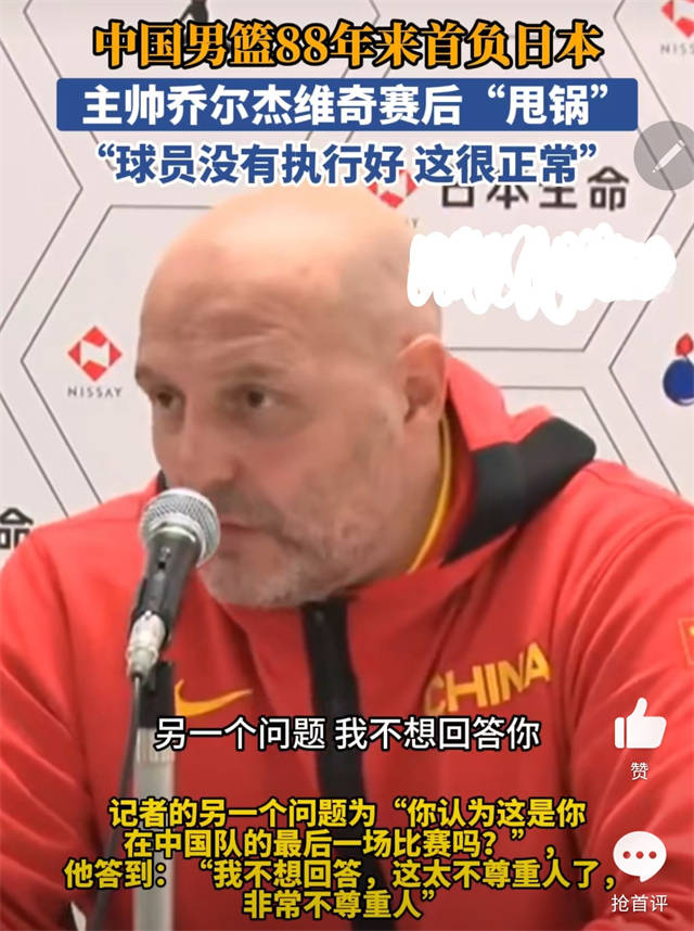 如果说乔尔杰维奇是要面子才回怼记者的话,那随后的回答却让人意识到他多么没有担当精神!在谈到中国男篮的最后一攻的争议话题时,老乔直接甩锅:“我们当时想快速传球找一个三分出手机会,但球员没理解好和执行好我的战术。”