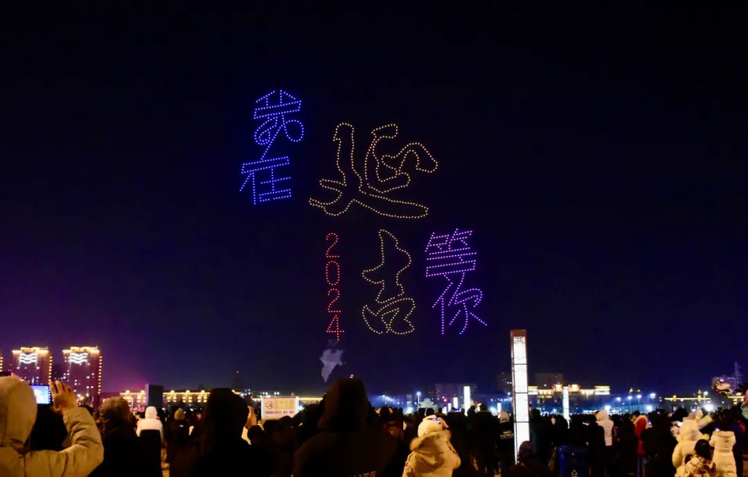 当晚,随着夜幕降临,活动现场人头攒动、热闹非凡,市民游客纷纷驻足、翘首以盼。“5、4、3、2、1!”19时30分许,在现场此起彼伏的掌声和欢呼声中,表演正式拉开帷幕。1000架科技感十足的无人机闪烁着各色彩灯冉冉升起、悬停天幕,在夜空中不断走位编队、变换组合,以起落交错的队形、变幻绚丽的灯光,精美巧妙地描绘出“红灯笼”、“龙翔万里”、“祥云明月”等图案,排列出“2024 我在延吉等你”等字样,形成了一幕幕精妙绝伦的立体画面,将中华优秀传统文化、甲辰龙年元素、延边城市韵味等一一生动呈现。现场,观众们纷纷举起手机拍照、录影,跟随无人机的表演欢呼雀跃,欣赏这场科技与艺术相结合的“高空光影秀”,感受科技增添的浓厚喜庆氛围!