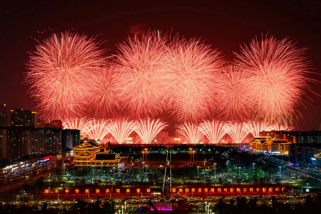 正当现场观众对无人机的精彩表演叹为观止之时,漫天焰火划破夜空,燃放焰火活动激情上演。随着一束束焰火腾空而起、直冲云霄,夜空刹那间被渲染得五彩缤纷、泛起阵阵霞光。仰望高空,各种造型的烟花在空中起舞,或如巨龙腾飞、孔雀开屏,或如金菊怒放、牡丹吐蕊,形态各异、争奇斗艳,描绘出一幅五光十色的唯美画面,营造了欢乐祥和的节日氛围,为全州各族群众和广大游客带来了一场美轮美奂的视觉盛宴。