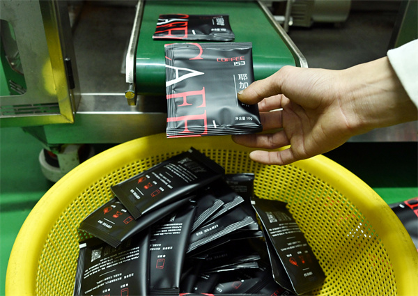 此时,经过机器筛选,质量好的熟豆又来到了下一台机器,在显示屏上输入包装克数,将已经灭菌的包装袋放在包装位置,通过感应,“刷”地一下,咖啡豆就按设定的重量灌满了包装袋,做好封口后,最终被销往州内150余家咖啡店。