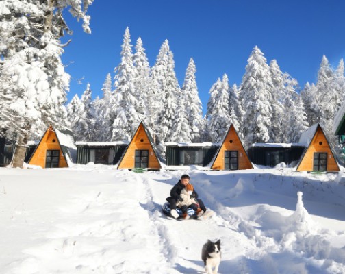 农历春节、元宵节后,和龙老里克湖景区游人不减,森林小木屋更是吸引了来自全国各地的游客。图为游客在森林木屋外滑雪圈。