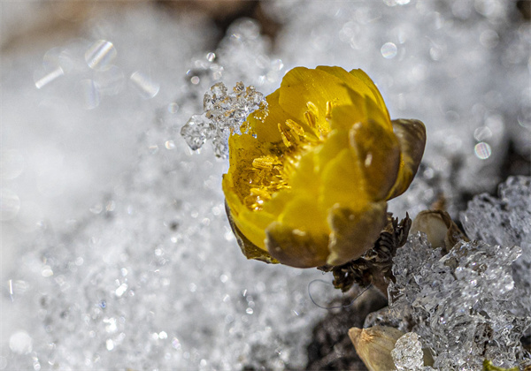 延边的阳春三月,有这样一种花,它从冬季的雪花手中接过“接力棒”,破冰而立、凌寒独放,细细的枝茎顽强挺立,金黄的花瓣在银色世界间释放幽香,为初春的大地带来了一抹鲜活的色彩,没错,它就是冰凌花。