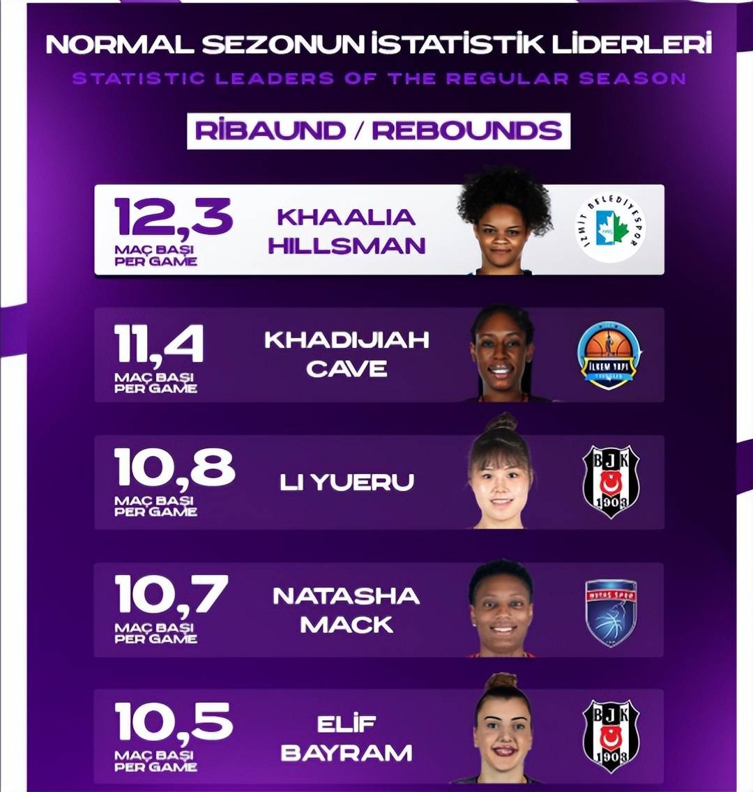 如今贝西克塔斯保持双线争冠的态势。土超联赛官方发布了常规赛各项数据统计排名前五的榜单,李月汝以场均10.8个篮板排名联赛第三、以场均25.1的效率值排名联赛第五。另外,李月汝18.5分的场均得分,也可以排在联赛前20。