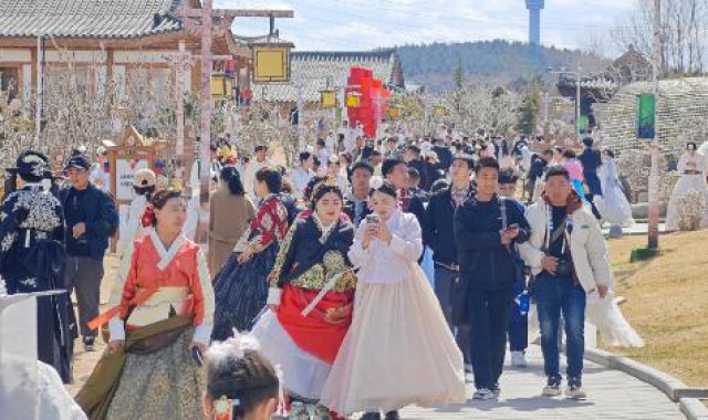 清明假期,延吉迎来旅游小高峰,众多游客慕名而来,体验延边独特的民族风情。图为4月4日,人流如织的中国朝鲜族民俗园。