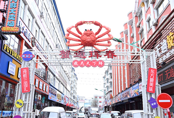 一只硕大的“帝王蟹”霸气地“站”在珲春市中心的海鲜街入口大门上,门两侧的对联“海鲜三国汇、东方最美味”很是豪迈,横批“敢为天下鲜”充满自信。在这条长145米的街上林立着数十家海鲜店铺,批发、加工、海鲜+烧烤,衍生的商业模式多种多样。每天早上,整车的海鲜从这里批发出货,每天傍晚,从国外运来的海鲜又及时补进来。