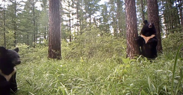视频最开始,是一只母熊携带2只幼崽在镜头前玩耍,其中一只幼熊略显害羞,藏匿于母熊身后,另一只熊活泼可爱,在镜头前活蹦乱跳,非常可爱,一家三口的温馨互动,让人感受到了野生动物世界的和谐与美好;有两只熊分别在白天和夜间,背靠大树,在树上蹭来蹭去,一左一右缓慢地摆动身体,尽显憨态可掬的一面。此外,视频还捕捉到了野生熊在林中闲逛、奔跑的画面,让大家看到了野生熊在大自然的真实状态。