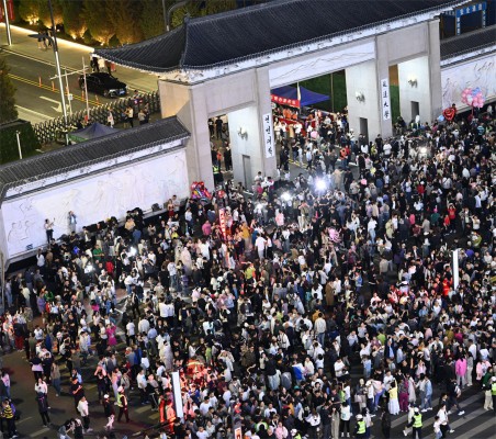 “五一”假期,延边迎来八方游客,延边大学网红墙再度成为热门“打卡地”。图为游客们在延大网红墙附近观看精彩的无人机表演。