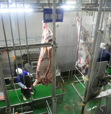 龙井长白山犇福清真肉业有限公司是集延边黄牛繁殖、养殖、育肥、屠宰加工于一体的大型企业。去年,该企业屠宰肉牛2117头,产量619吨,产值5106万元。图为该公司肉牛屠宰加工车间。