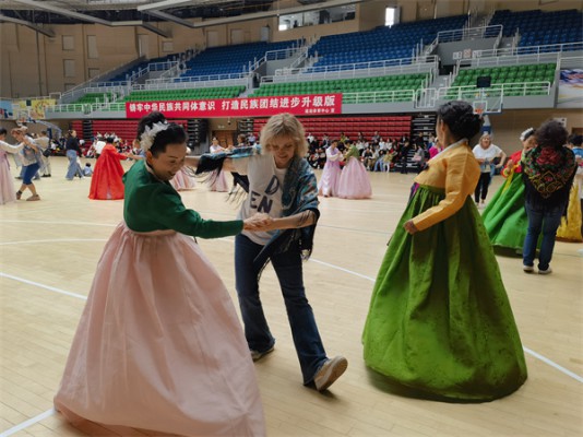 在友好、融洽的气氛中,中俄运动员一起奔跑、跳跃,洋溢体育激情,展示文艺魅力。龙井市赞星艺术团的演员表演了朝鲜族歌舞、圆鼓舞等节目,让俄罗斯观众耳目一新。双方老年人携手共舞,现场氛围异常热烈。