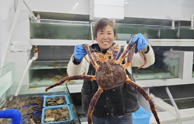 珲春市个体工商户刘丽梅依托珲春“帝王蟹”的良好口碑,走上了致富之路。她在珲春海鲜街经营一家海鲜店,每天仅帝王蟹就可销售100多公斤,月收入逾1万元。