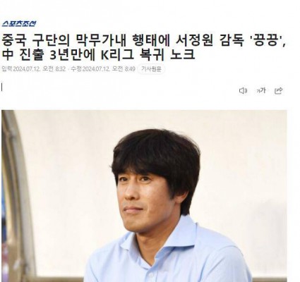 北京时间7月12日消息,据韩国媒体朝鲜体育报道,成都蓉城队主帅徐正源正考虑重返韩国联赛。