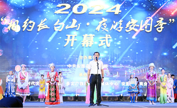 开幕式上,安图县委常委、宣传部部长唐国强致辞。他表示,安图素有“长白山第一县”的美誉,拥有得天独厚的自然景观和丰富多样的文化底蕴,连续7年蝉联“中国最美县域榜单”,连续3年被评为“中国旅游发展潜力百强县”。2024上半年接待旅游人数479万人次,旅游收入达62.2亿元,创历史新高,并成功入选“2024年全国县域文旅融合综合竞争力100强”榜单。此次,安图县联动旅游景区,合力打造地域特色文旅“夜”品牌,为全县群众和往来游客提供了多样化的夜间旅游项目,真诚邀请国内外游客到安图来,乐享美好“夜”旅程。