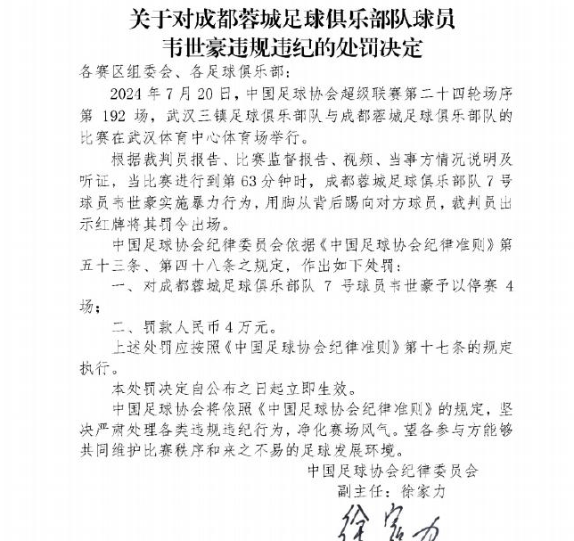 终究还是没有逃过中国足协的追加处罚,韦世豪因为在上一轮对阵武汉三镇的比赛中踢倒前队友邓涵文,被足协追加停赛4场,罚款4万元。