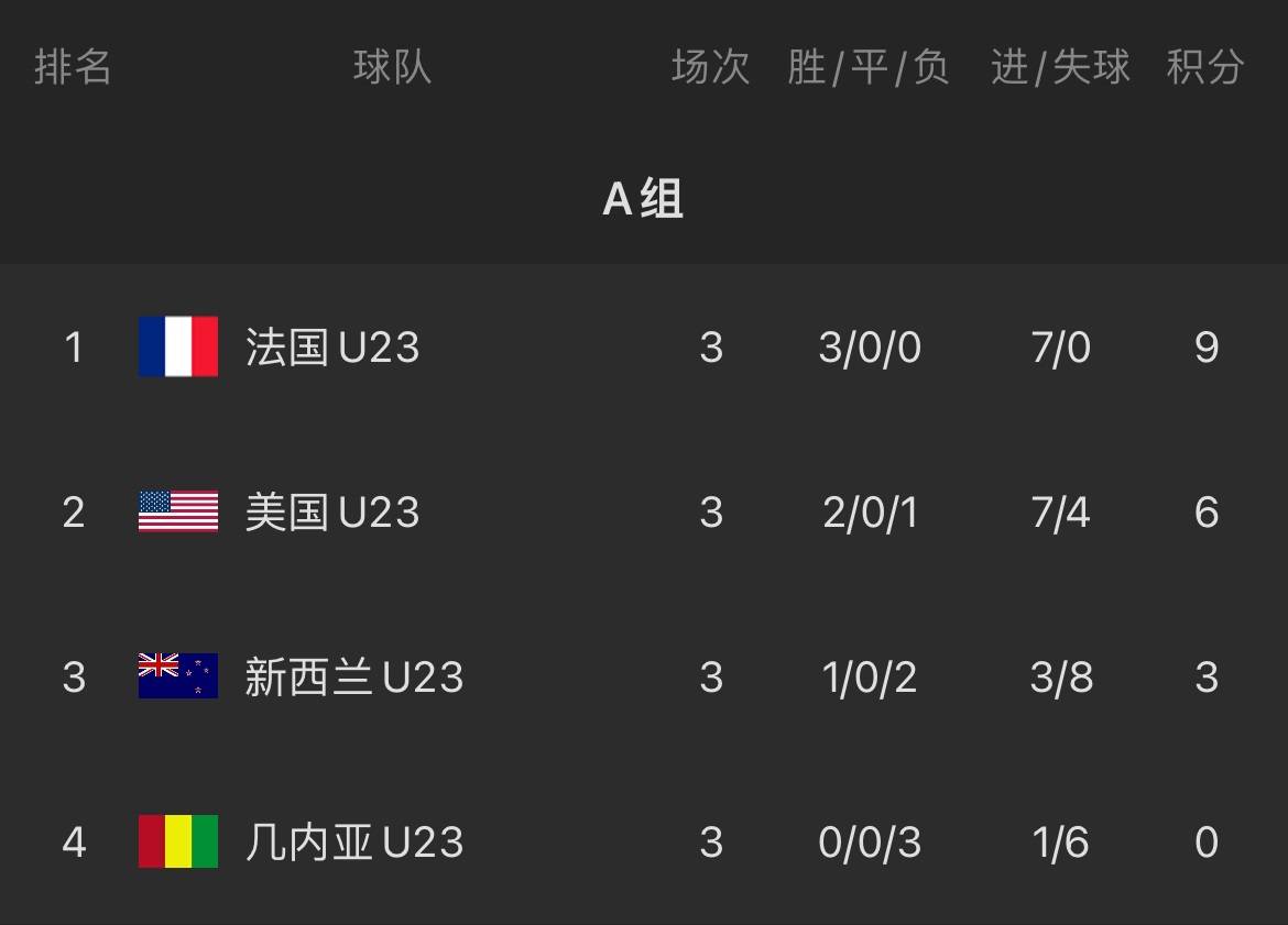 法国、美国、新西兰、几内亚,东道主显然没亏待自己,除了美国,新西兰、几内亚实力有限。虽然没能招入姆巴佩这样的猛人,但亨利执教的这支法国国奥,总身价仍高达3.93亿欧元,纸面实力最强。小组赛3战全胜积9分小组第一出线,进7球0失球,与日本并列小组赛成绩最好。