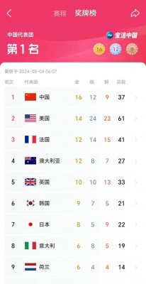 北京时间2024年8月3日,随着巴黎奥运会第八个比赛日的落幕,金牌榜再次更新。中国体育代表团在这一天再次展现出强大的竞技实力,单日斩获三枚金牌,稳居金牌榜首位,总计获得16金12银9铜的优异成绩。美国队以14金24银23铜的成绩上升至第二,法国队以12金14银15铜紧随其后,澳大利亚队和英国队分列第四和第五。
