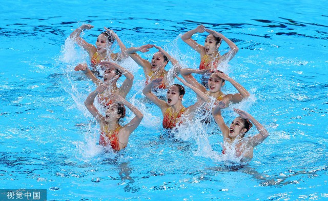 由冯雨、常昊、王赐月、张雅怡、王柳懿、王芊懿、肖雁宁、向玢璇组成的中国队全场最后一组出场,此次她们表演的曲目是《生命之光》,难度分达到了49.800分,排名全场第二,在这套曾多次使用的经典节目中,中国队展现了规范的技术和精湛的表演,裁判慷慨地打出了技术分211.9538、节目内容分101.6000的超高分,最终中国队以313.5538分、超过26分的巨大优势暂时排名第一位。