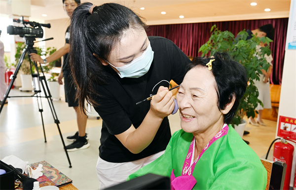 活动中,老人们身着美丽的服饰,端坐在现场。学员们为每位老人描画出既精致又美丽的妆容。开始前,一些老人略显羞涩,担心自己的皮肤已显老态,化妆不能展现美丽。学员们耐心地安慰她们,并精心施妆,让老人们的妆容自然淡雅。随着妆容的完成,老人们逐渐展露笑容。延吉市妇联负责人表示,希望通过此次活动能让老人们在专属的节日中焕发独特的光彩。