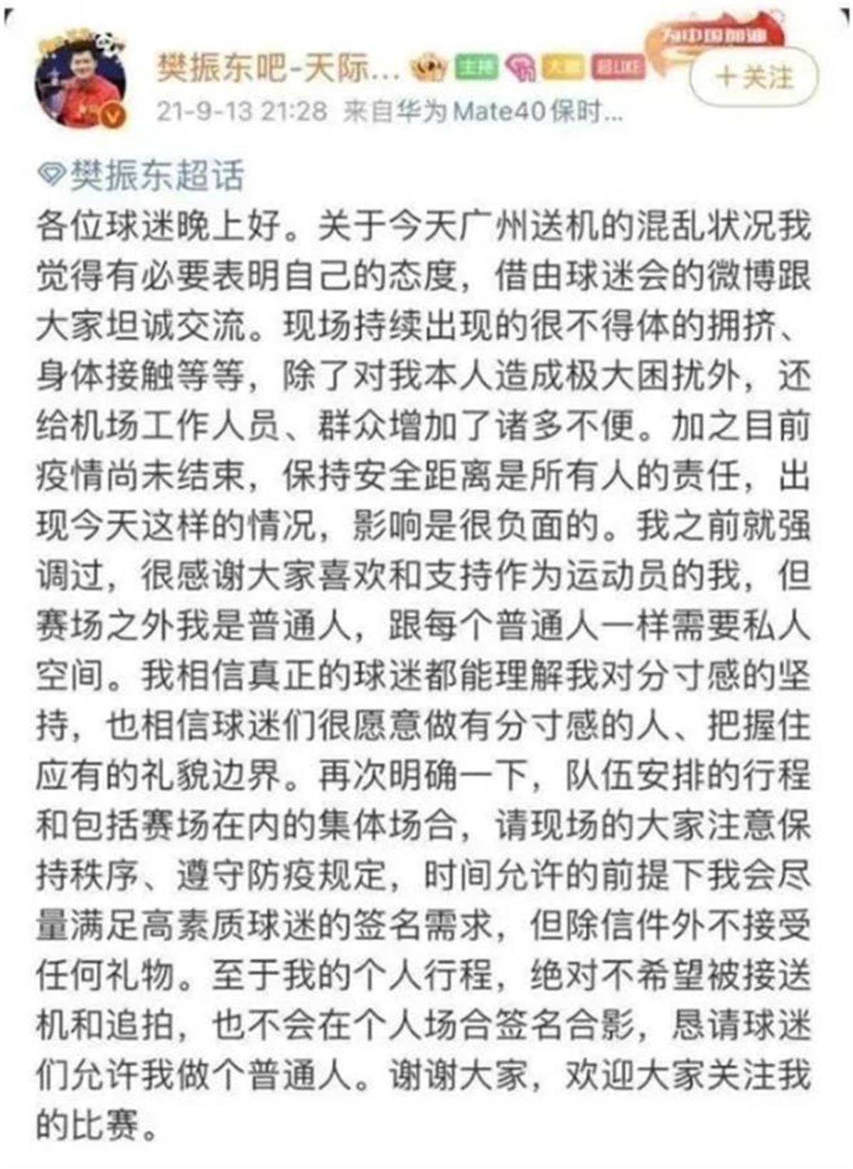 2021年9月13日,国乒队从广州出发前往西安参加全运会,大批粉丝云集机场,对着运动员近距离怼脸狂拍。当天,感到不适的樊振东通过球迷会的微博发声:赛场之外我是普通人,跟每个普通人一样需要私人空间。樊振东此时还说得比较客气,没有直接点名饭圈。