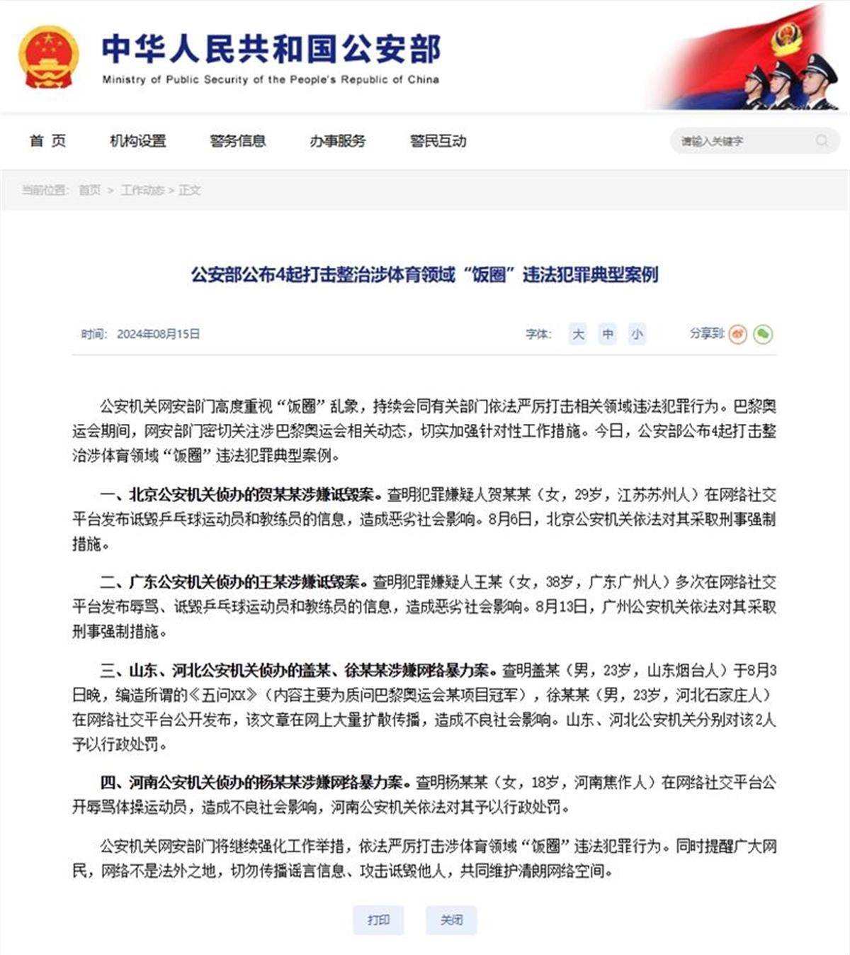 公安部公布了4起打击整治涉体育领域“饭圈”违法犯罪典型案例(公安部官网截图)