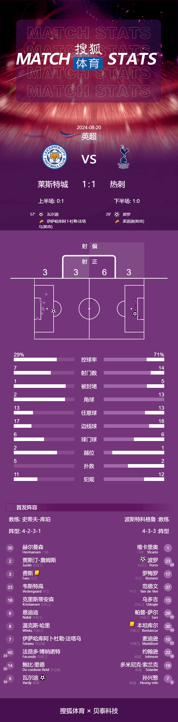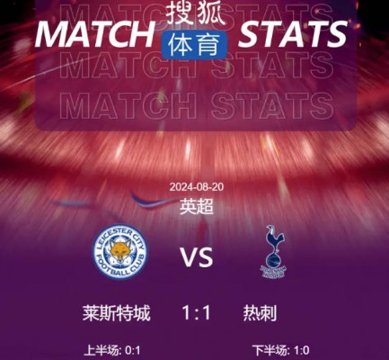 北京时间2024年8月20日凌晨3:00,英超24/25赛季第1轮,莱斯特城主场迎战热刺。上半场,波罗头球破门为热刺取得领先。下半场,瓦尔迪同样以头球扳平比分。最终,双方1-1握手言和。当前积分排名,莱斯特城和热刺均位列第11位。