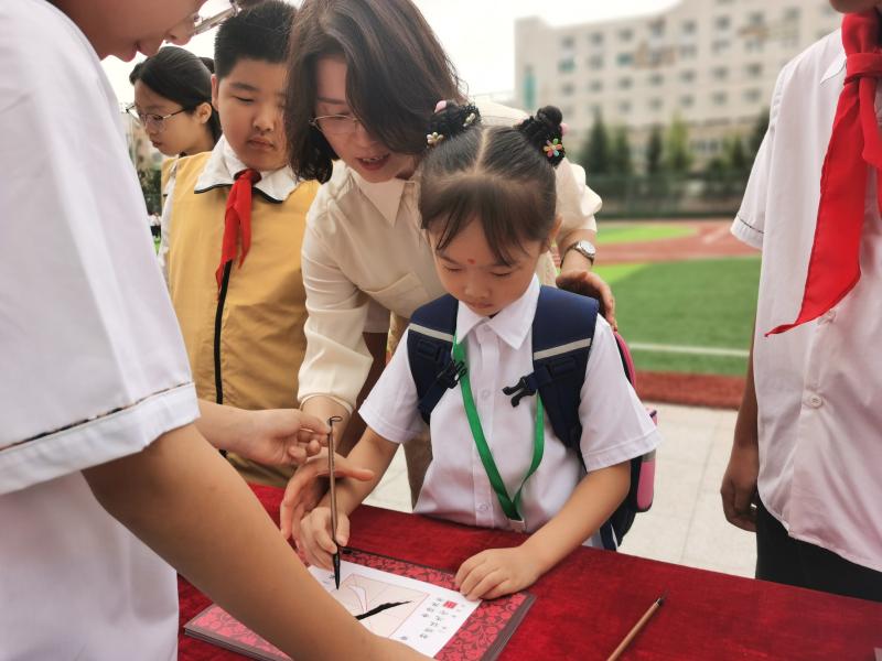 “朱砂启智,祝愿同学们眼明心亮,好读书、读好书;开笔添智,教导新生们一撇一捺写成‘人’;击鼓传志,寓意学生尊敬师长、勤奋学习、茅塞顿开……”主教学楼前,李顺福和李花、金贞姬、金今实等校领导组成的“先生团”,用一场庄重而别开生面的“开学礼”,在浓浓的传统文化氛围中,为学生们开启求学之门,让教师们体悟教书育人的智慧与情怀。