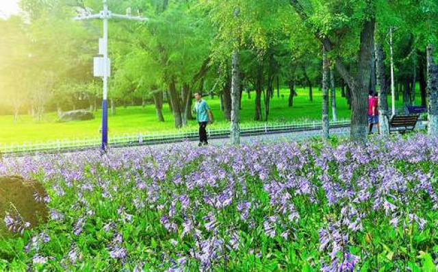 近日,延吉市人民公园内的玉簪花迎来盛花期,在繁茂的绿意中竞相绽放,散发出阵阵清香。图为市民在花海中散步。