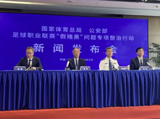 搜狐体育消息,北京时间9月10日,国家体育总局、公安部联合召开的足球职业联赛“假赌黑”问题专项整治行动新闻发布会正在大连进行。去年以来,针对足球领域严重假球、赌球、黑哨问题,体育总局、公安部、中国足协联合展开了足球行业的专项治理行动。