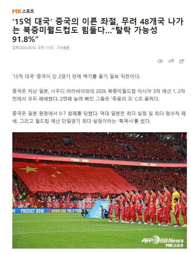 对于中国队前两轮的表现,韩国媒体MK体育撰文评论称,拥有15亿人口的中国足球,在仅仅两场比赛之后就处于举白旗的边缘。