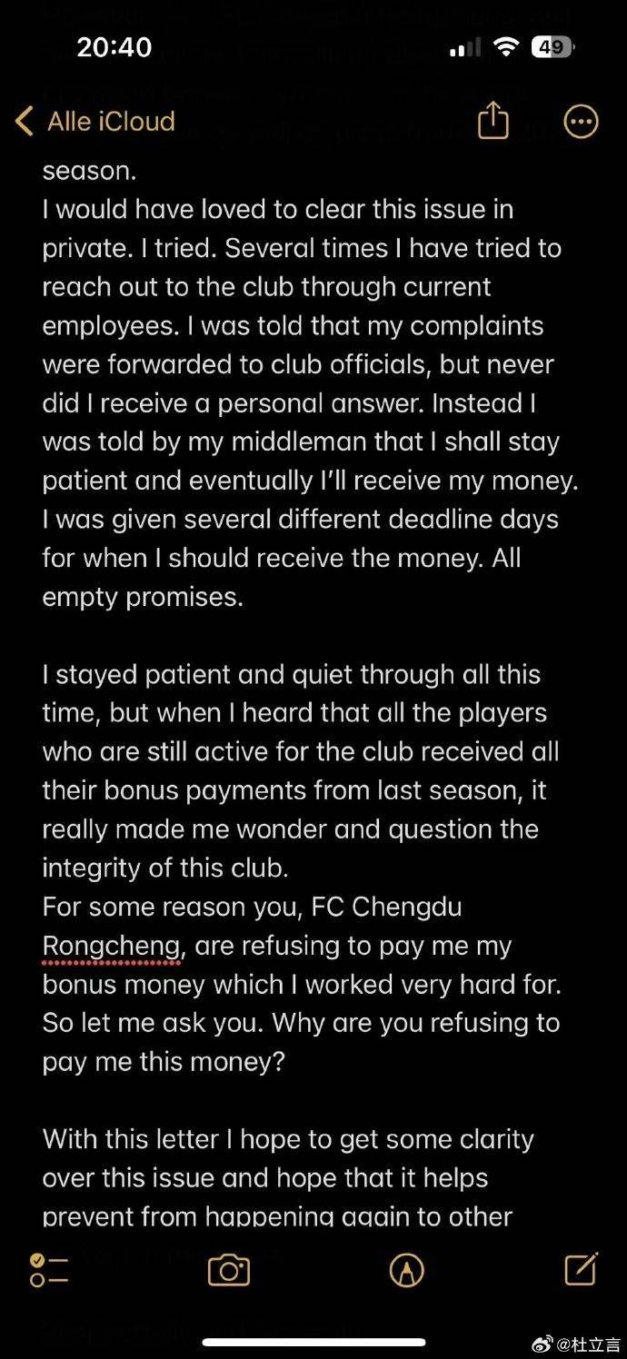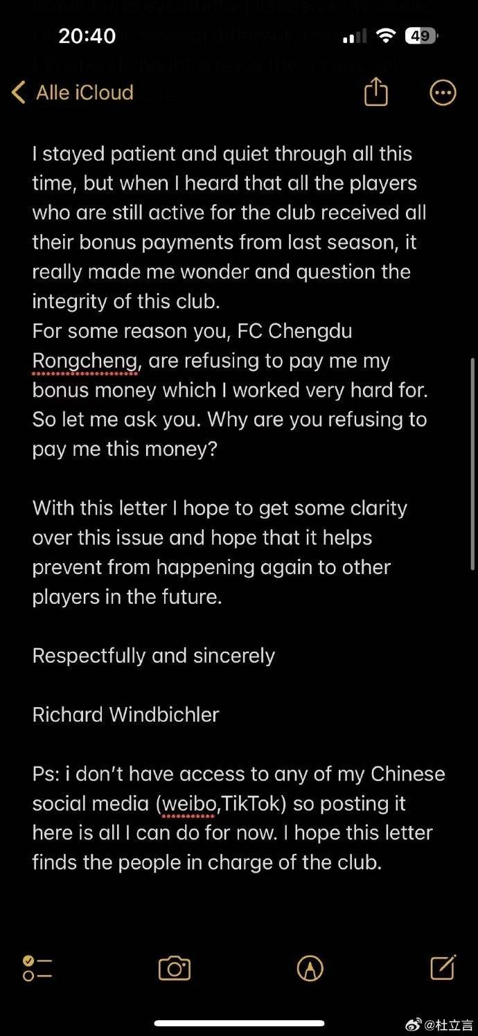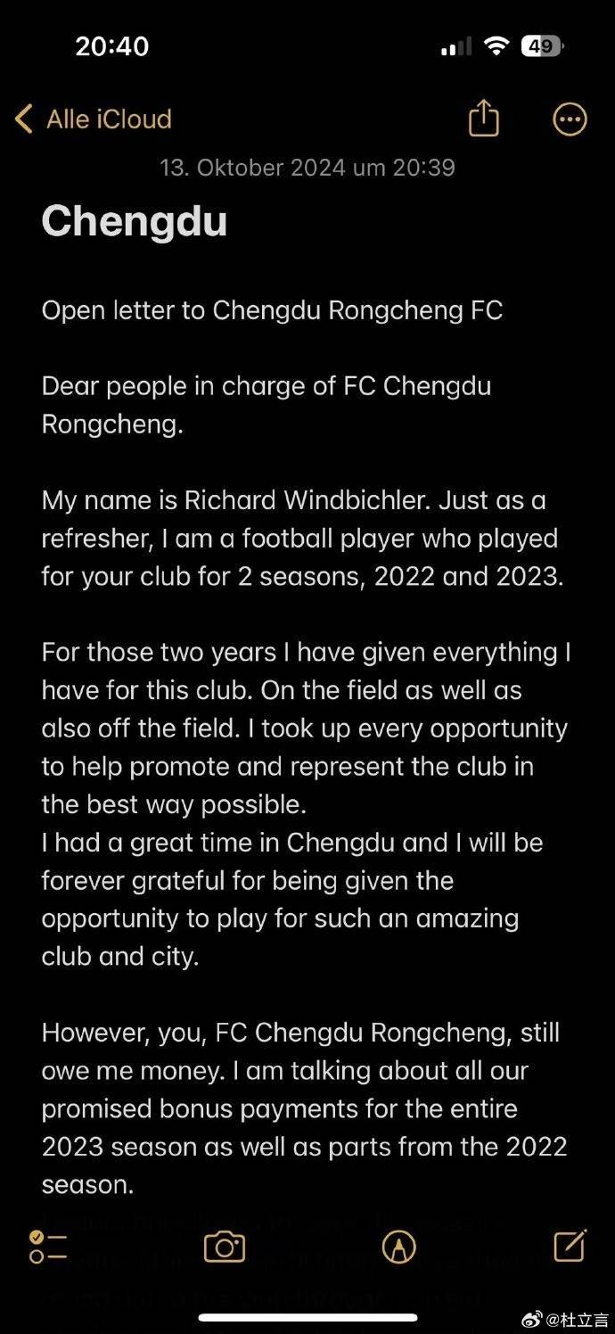 直播吧10月14日讯 媒体人杜立言透露,前成都蓉城外援理查德向俱乐部讨薪,他给成都蓉城写了一封公开信。